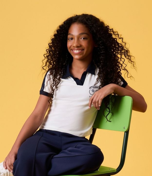 Blusa infantil baby tee confeccionada em cotton certificado BCI e boas práticas ambientais. Possui gola polo contrastante, mangas curtas com listras esportivas e estampa college ATLANTA em lettering localizado, entregando visual moderno e versátil inspirado no universo universitário.