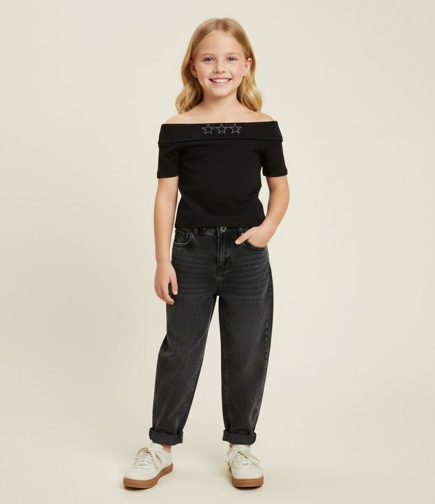 Blusa Infantil Baby Tee Ombro a Ombro com Estrelas – Tam 7 a 16 Anos Preto