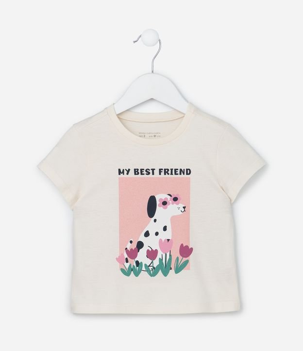 Blusa infantil confeccionada em algodão mais sustentável. Possui gola redonda, manga curta e estampa de cachorrinho de óculos e lettering "My best friend".