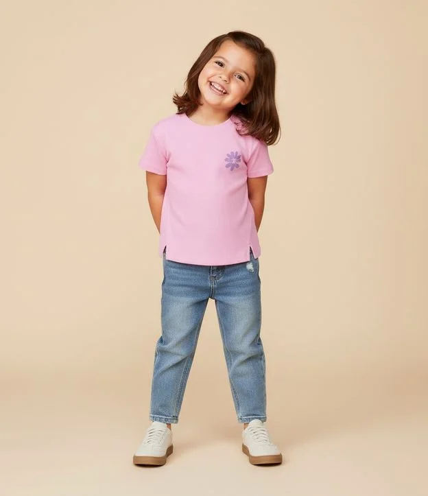 Blusa infantil confeccionada em meia malha de algodão certificado BCI, com gola redonda e mangas curtas. Possui estampa localizada de flor com lettering aplicado na parte frontal e traseira, além de recortes laterais na barra que complementam a estrutura da peça.