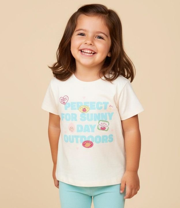Blusa infantil confeccionada em algodão mais sustentável através de boas práticas ambientais. Possui gola redonda, manga curta, estampa lettering "Perfect for sunny day outdoors" e selinhos divertidos.