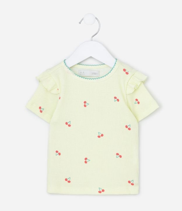 Blusa infantil confeccionada em ribana mais sustentável. Possui gola redonda, manga curta, com babadinhos e estampa de cerejas.