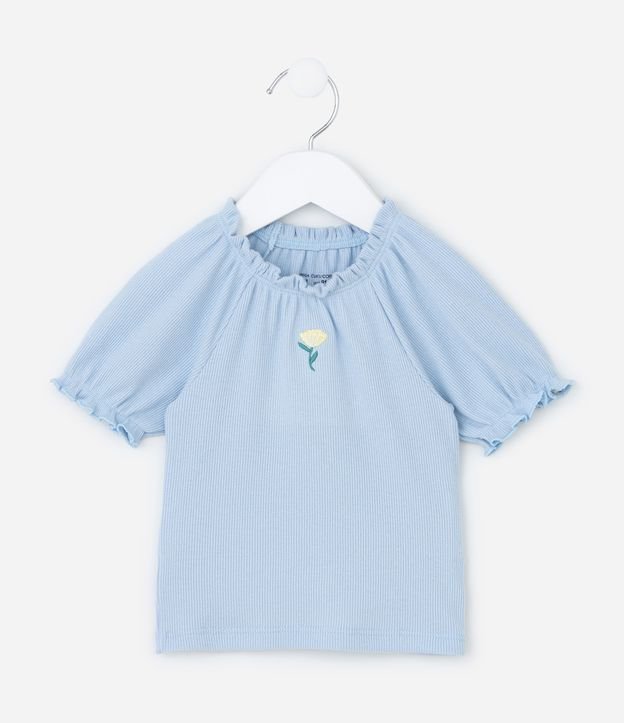 Blusa infantil confeccionada em ribana canelada, de material mais sustentável. Possui gola redonda com elástico, mangas curtas bufantes e bordadinho de flor no peito.