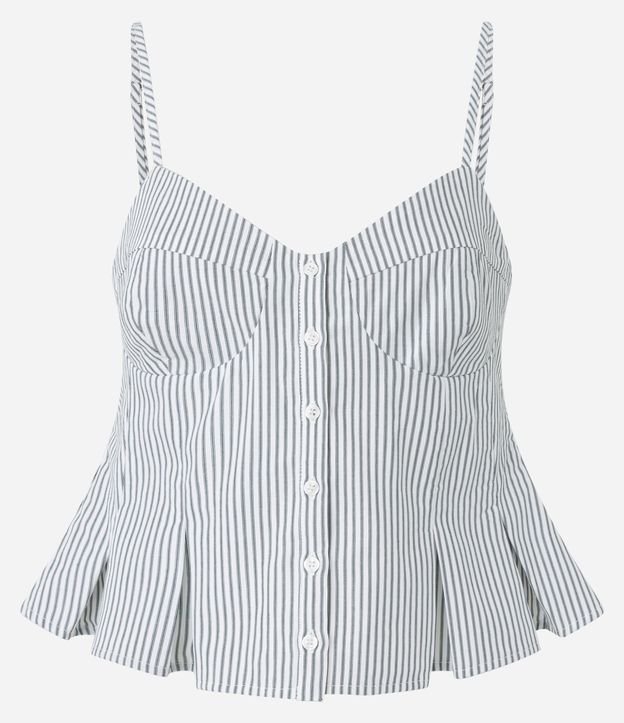 Blusa feminina em tricoline confeccionado em algodão certificado mais sustentável. Possui estampa listrada, alças finas reguláveis, decote coração, fechamento frontal por botões e barra com pregas marcadas.