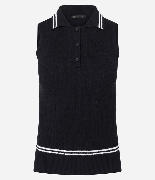 Blusa feminina confeccionada em viscose certificada. Possui modelo sem mangas, gola polo com três botões frontais e acabamento canelado na barra. Apresenta detalhes contrastantes aplicados na gola e na região inferior, oferecendo destaque visual.