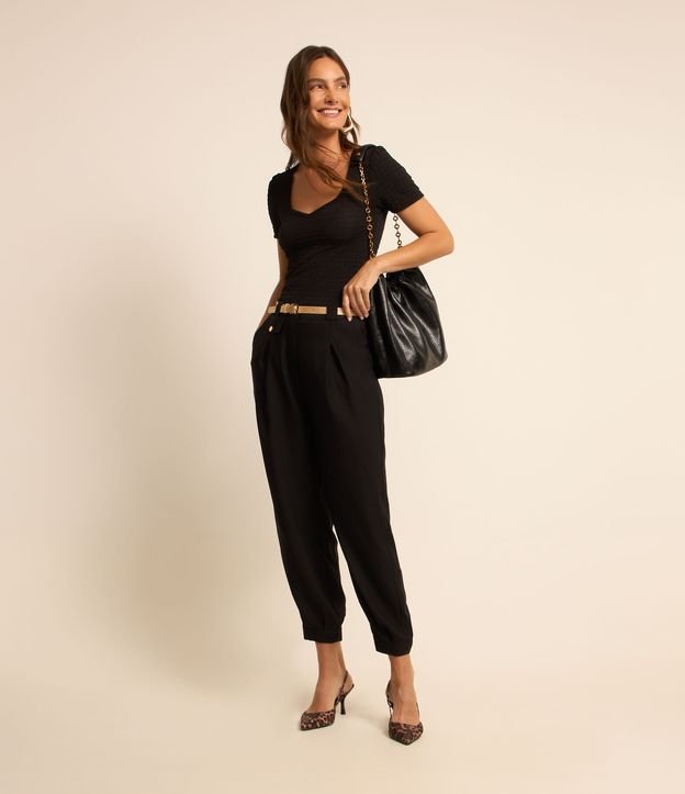 Blusa de mangas curtas com decote coração e malha texturizada. Possui textura xadrez com aspecto áspero.