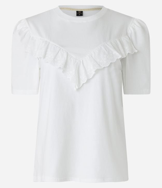 Blusa Manga Curta em Meia Malha com Babado de Renda Off White