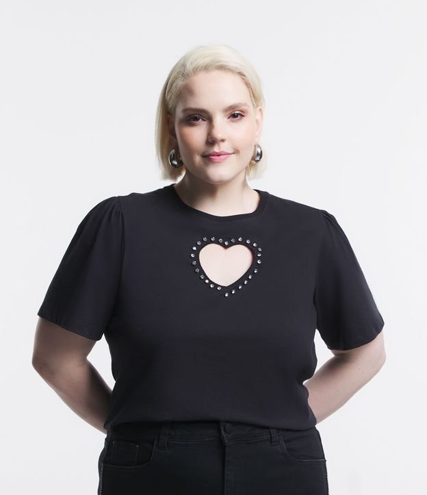 Blusa Manga Curta em Meia Malha com Coração Vazado com Brilhos
