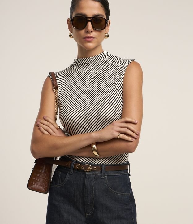 Blusa manga curta confeccionada moletinho com estampa de listras e gola alta.