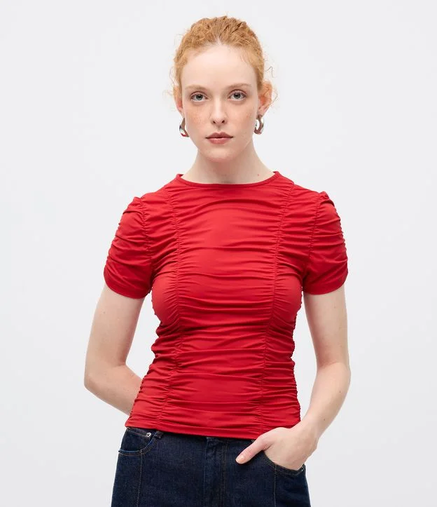 Blusa Manga Curta em Poliamida com Drapeado Vermelho