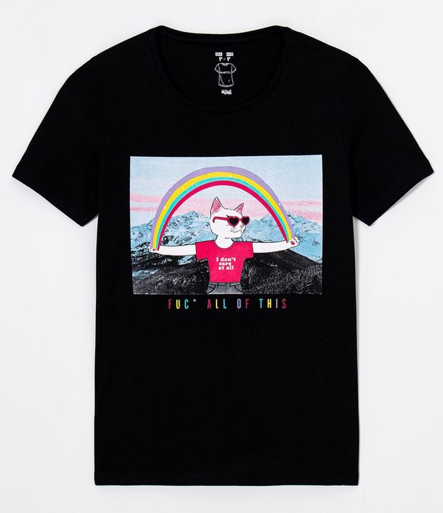 Blusa Manga Curta Estampa Gatinha e Arco-Íris