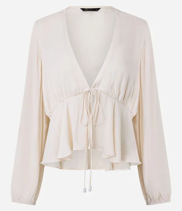 Blusa feminina com manga longa, decote em v, amarração frontal, recorte na cintura com leve peplum e barra fluida. As mangas têm elástico no punho, garantindo caimento leve e confortável para compor looks casuais.