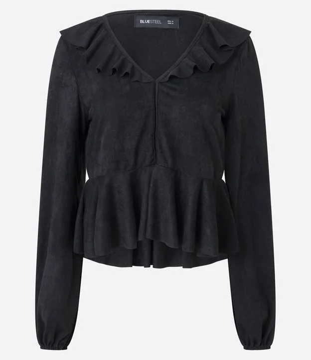Blusa em suede com toque macio e visual elegante. Possui decote em V, babado aplicado e barra peplum que valoriza o caimento. As mangas longas completam a proposta delicada e moderna, ideal para compor looks fashion com conforto e versatilidade.