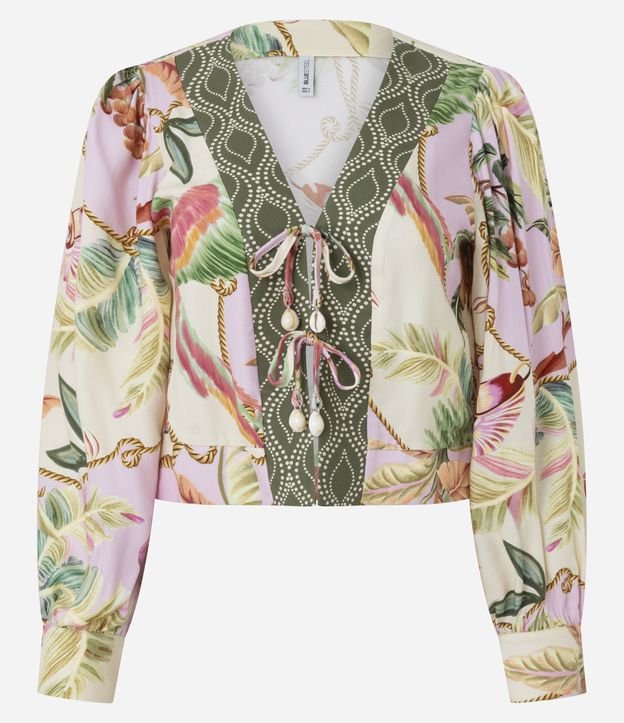 Blusa confeccionada em viscolinho com estampa tropical, gola V e detalhe de amarração frontal com ponteiras decorativas. Possui mangas longas com punho e modelagem diferenciada, ideal para compor looks leves e sofisticados. Peça confeccionada em viscose certificada.