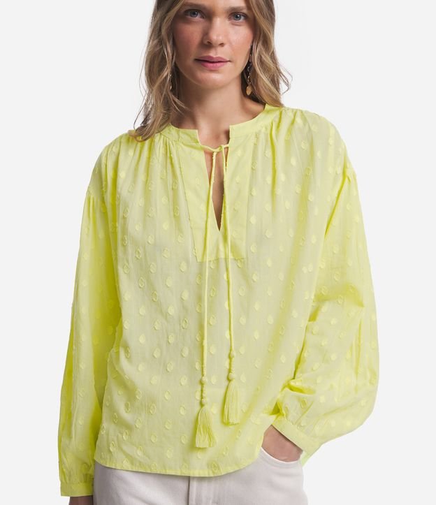 Blusa Manga Longa em Algodão Texturizado com Amarração no Decote