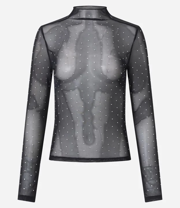 Blusa em tule com transparência e aplicações, que adicionam brilho sutil ao visual. O modelo de manga longa possui gola alta e caimento ajustado, ideal para compor produções noturnas modernas.