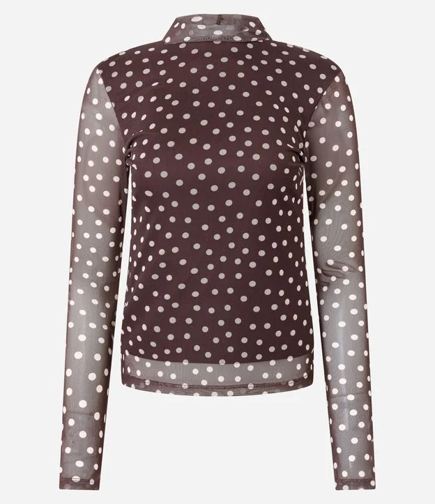 Blusa Manga Longa em Tule com Estampa Poa Marrom