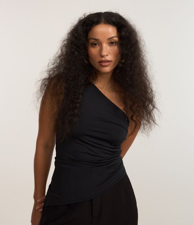 Blusa Ombro Só em Jersey com Barra Assimétrica e Franzidos Preto