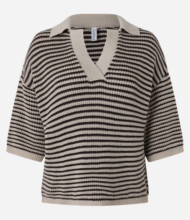 Blusa Over Alongada em Tricô com Gola Polo Listrada Marrom