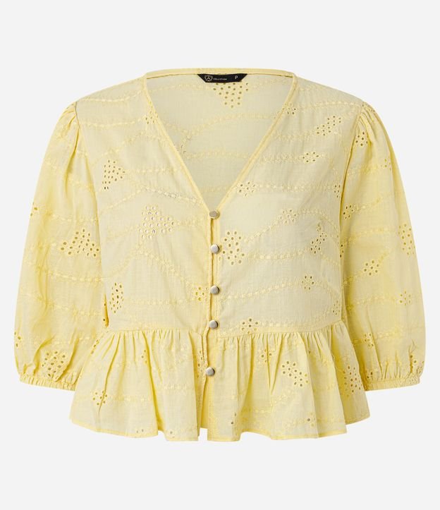 Blusa Peplum em Laise com Botões e Bordado Vazado Amarelo