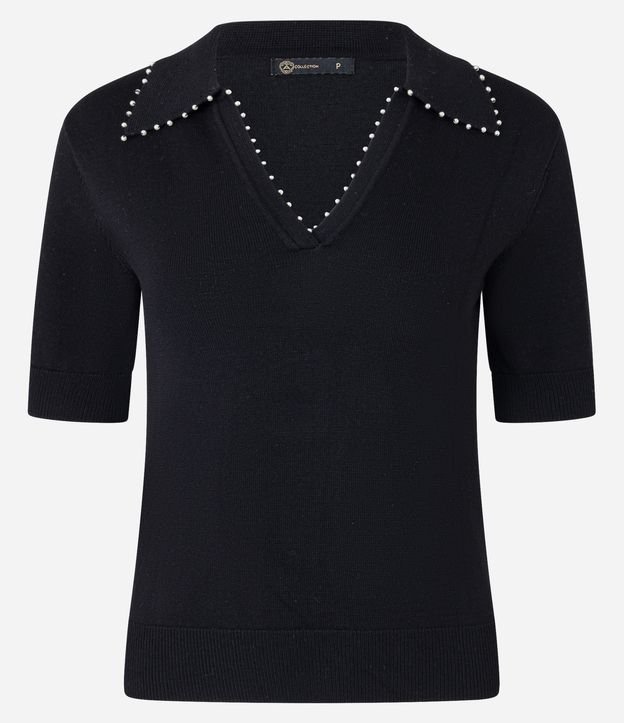Blusa Polo em Tricô com Mini Pérolas no Decote V Preto