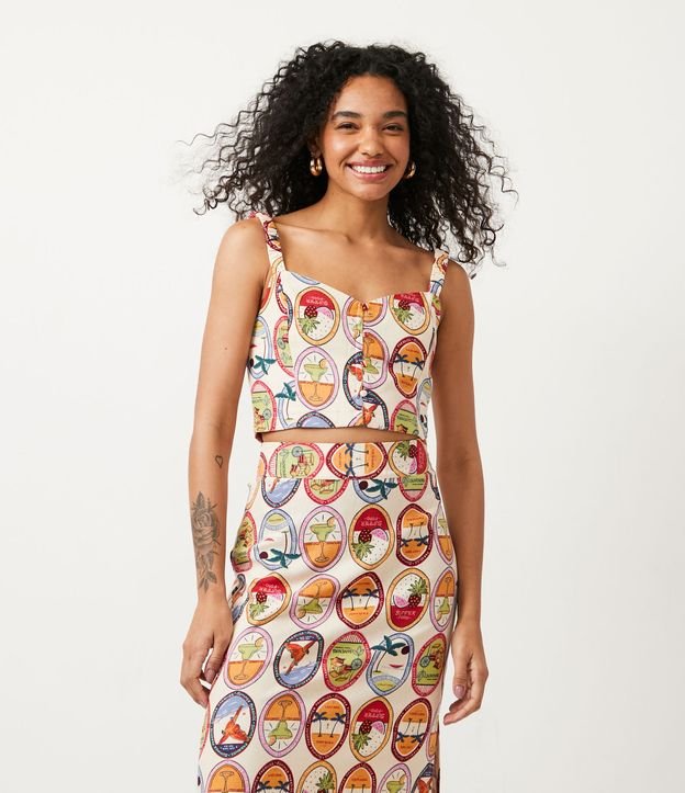 Blusa Regata Cropped em Linho com Estampa com Selos Tropicais