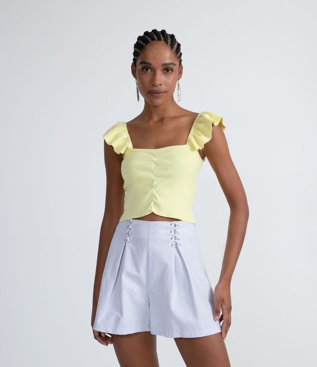 Blusa Regata Cropped em Tricô com Babado na Alça e Franzido Frontal