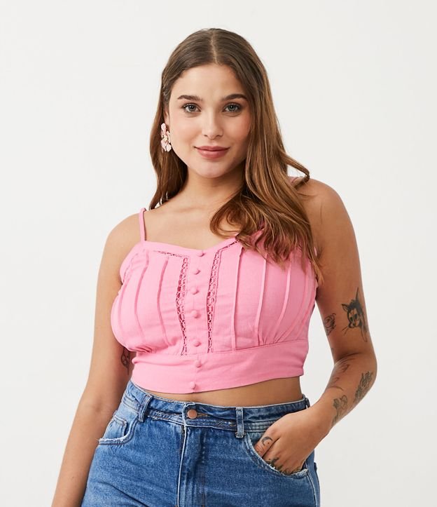 Blusa Cropped de Alcinhas em Viscolinho com Entremeios e Botões Forrados