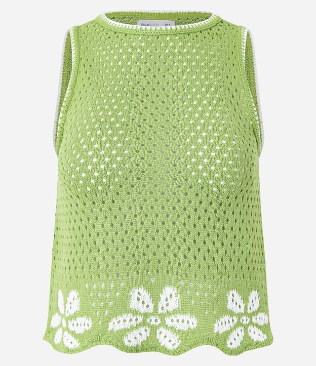 Blusa regata feminina em tricô com cola redonda, viés contrastantes e florzinhas na barra com babado.