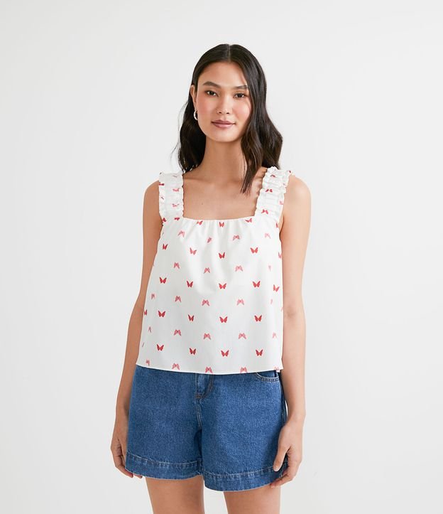 Blusa Regata em Tricoline com Alças Largas Franzidas e Estampa de Borboletas