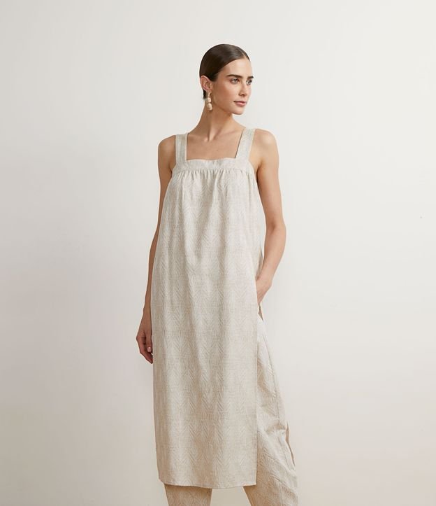 Blusa Regata Túnica em Viscolinho Bordado de Folhas e Fenda Frontal