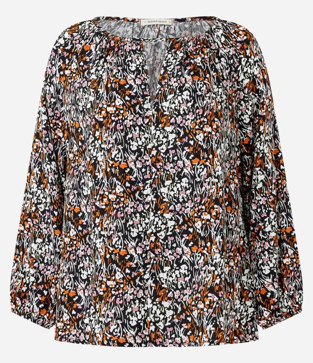 Blusa Regular em Sarja com Decote V e Estampa Floral Multicores