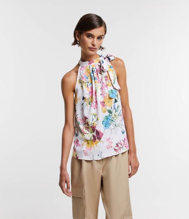 Blusa Sem Manga com Laço na Gola e Flores Estampadas