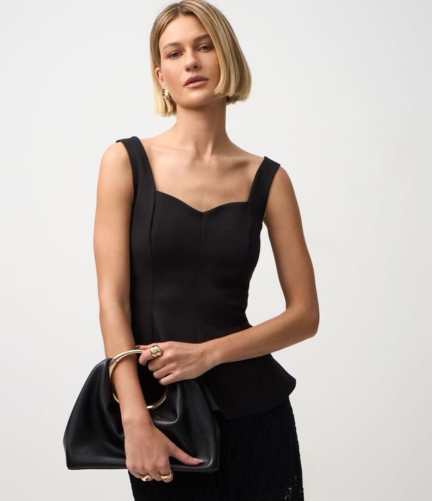 Blusa feminina confeccionada em crepe através de boas práticas ambientais. Possui modelagem peplum, alças largas, decote coração e fechamento em zíper lateral.