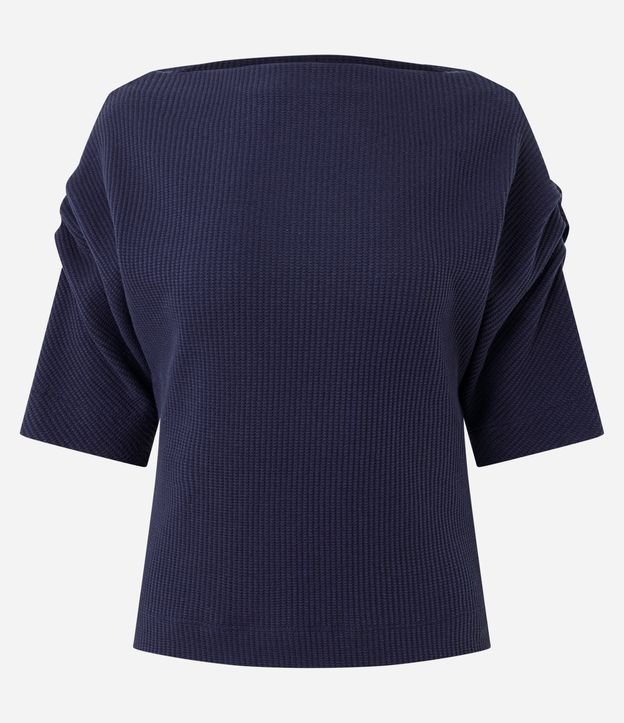 Blusa feminina de manga curta em malha canelada texturizada confeccionada com algodão mais sustentável. Possui modelo com gola ampla e caimento reto. Apresenta pregas marcadas nos ombros que criam volume sutil.