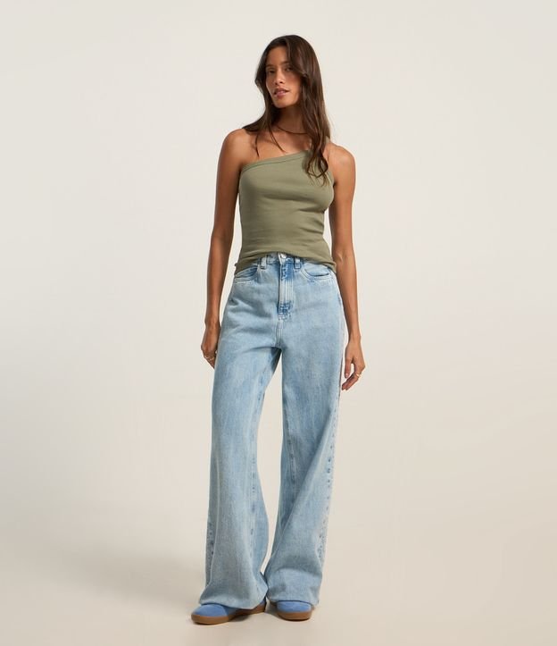 Blusa confeccionada em ribana, decote um ombro só com alça fina e textura leve.
