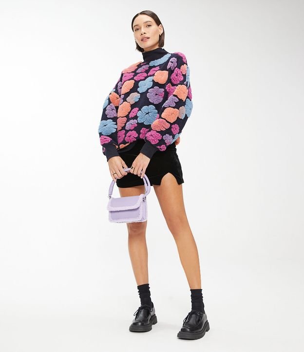 Blusão Alongado em Tricô com Flores Coloridas em Relevo