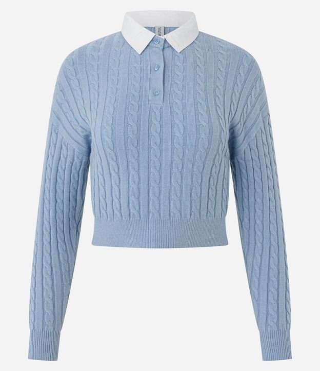 Blusão Cropped em Tricô com Gola Polo Contrastante Azul