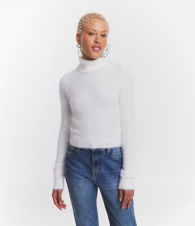 Suéter Cropped em Tricô com Pelinhos e Gola Alta