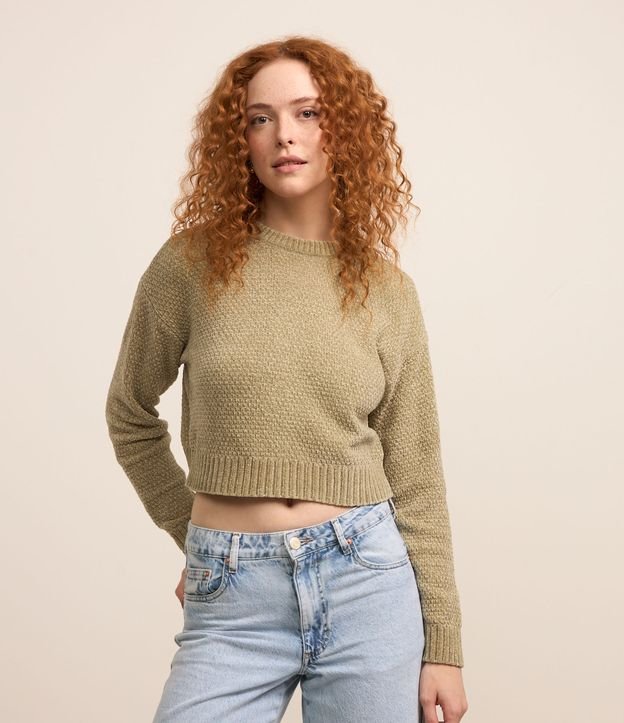 Suéter Curto em Tricô com Ponto Diferenciado Verde
