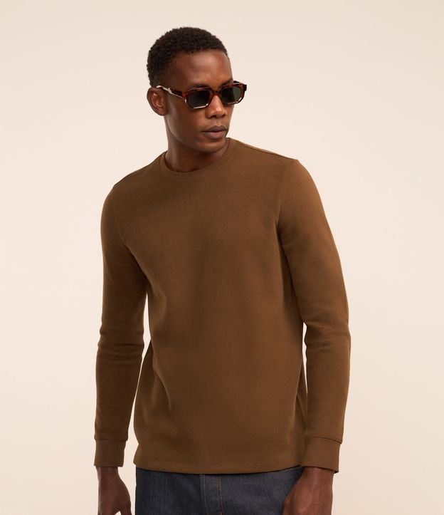 Blusão confeccionado em malha de algodão, sem estampa, com gola redonda, mangas longas e punhos ajustados.