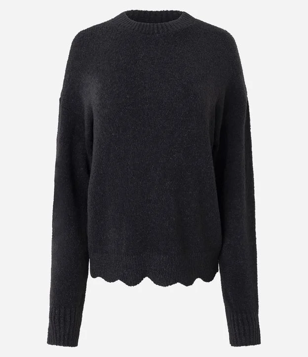 Blusão em Tricô Mousse Liso com Barra Ondulada Preto