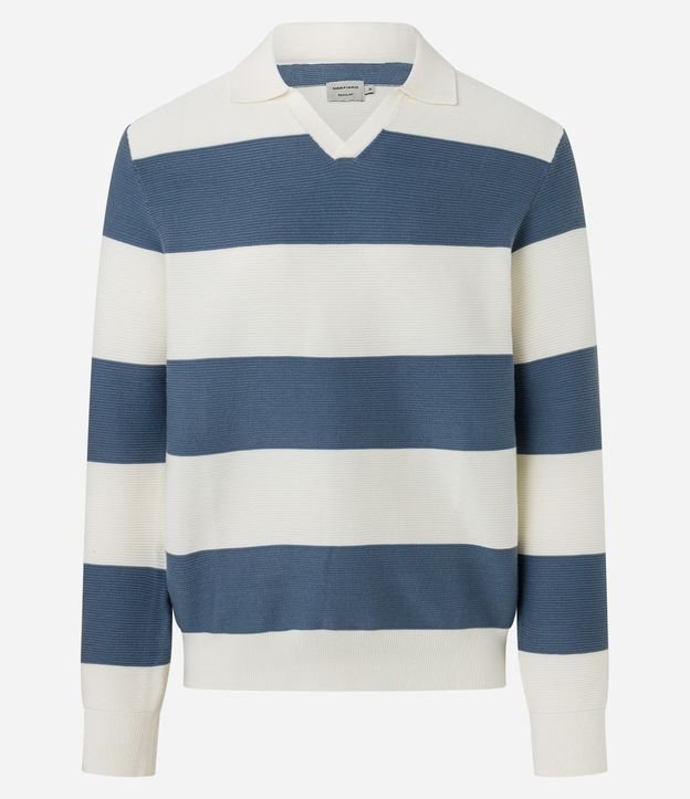 Blusão em Viscose Meia Malha com Gola Lapela e Estampa Listrada Azul/Branco