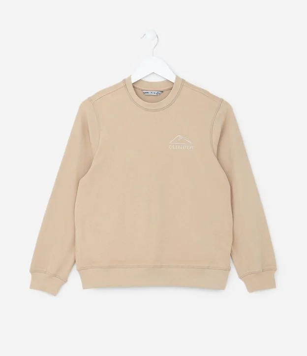 Blusão infantil confeccionado em fleece, com gola redonda, manga longa e bordado no peito de montanhas com lettering "Climber".