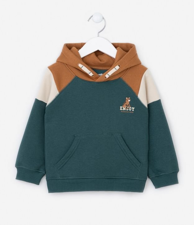 Blusão infantil em moletom quentinho, com capuz, recortes contrastantes, bolso frontal e estampa de trigrinho no peito.