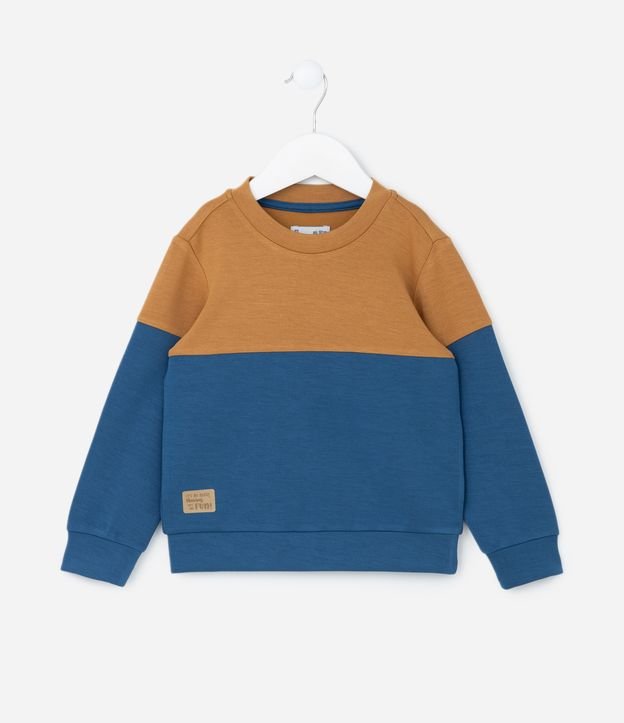 Blusão infantil confeccionado em modal, com recortes contrastantes, mangas longa e tag na barra.
