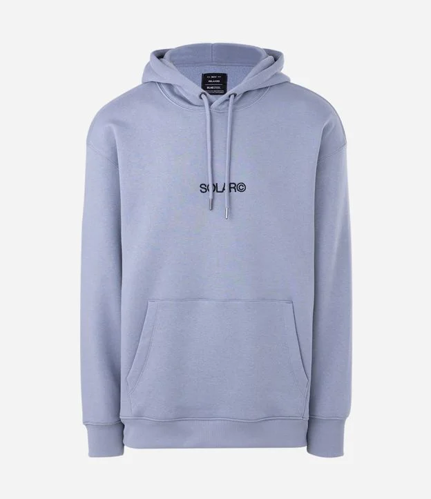Blusão masculino confeccionado em moletom com felpa de algodão mais sustentável, em tom azul claro, com gola com capuz, bolso canguru e modelagem relaxed, apresentando lettering Solar bordado no peito e estampa localizada nas costas com referências outdoor, ideal para um visual casual moderno com conforto e personalidade.