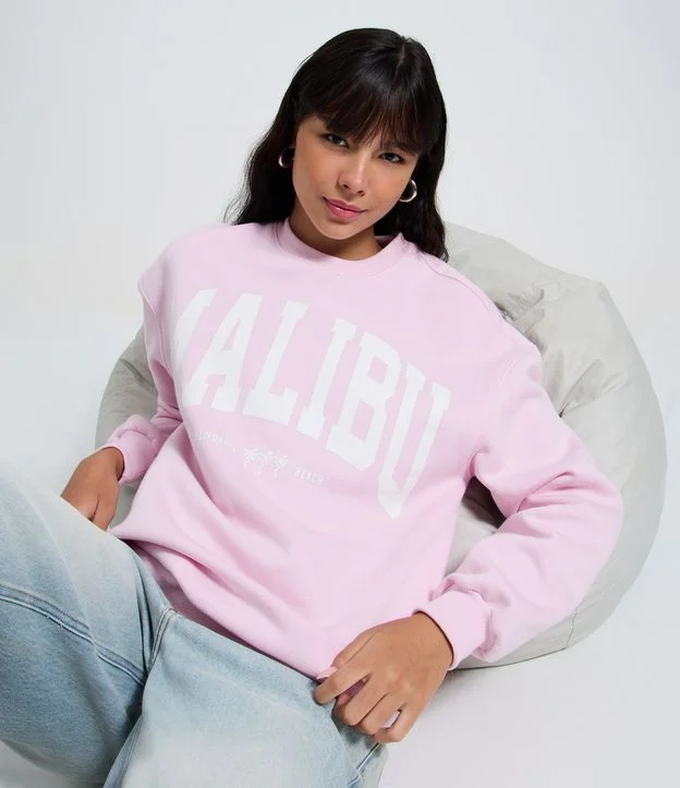 Blusão Moletom com Gola Redonda e Estampa Central Rosa
