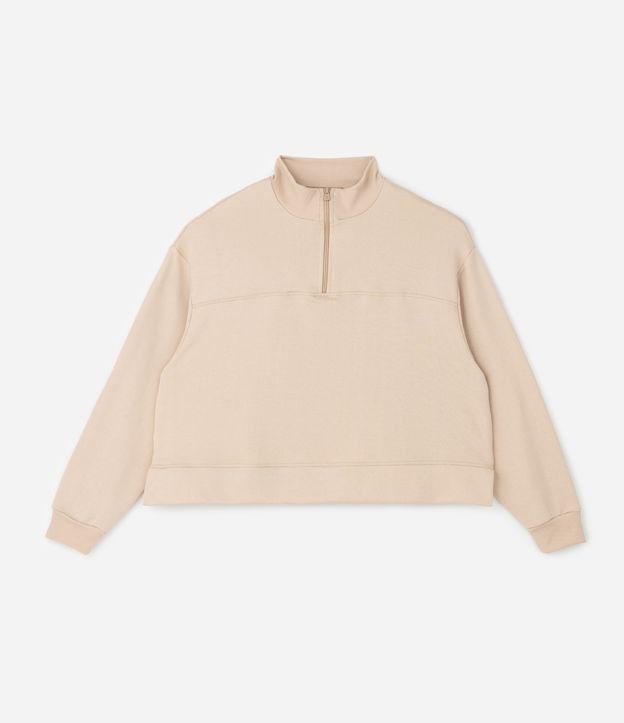 Blusão Moletom Esportivo com Half Zíper e Abertura Lateral Curve & Plus Size Bege
