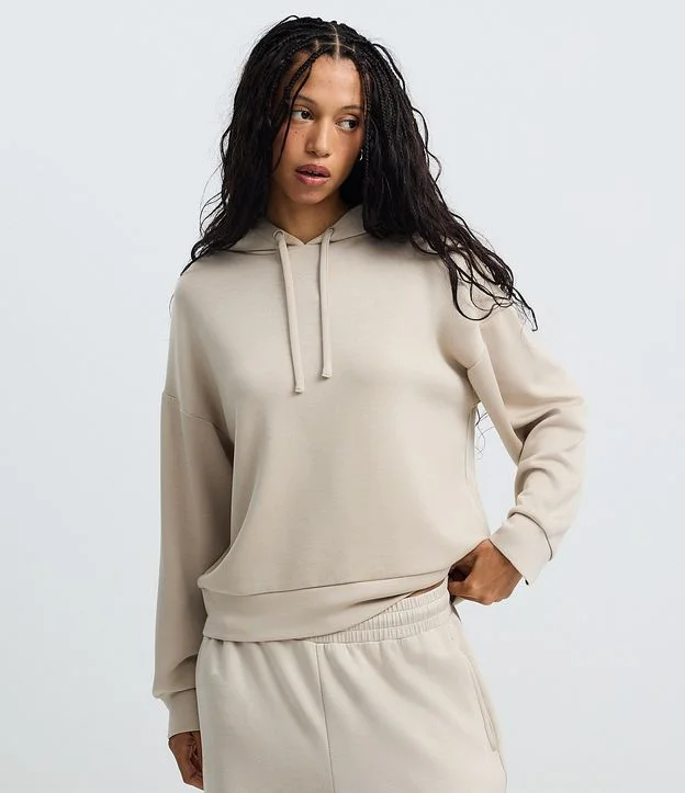 Blusão oversized feminino confeccionado em poliéster certificado. Possui modelo com mangas longas, punhos ajustados e capuz com amarração.